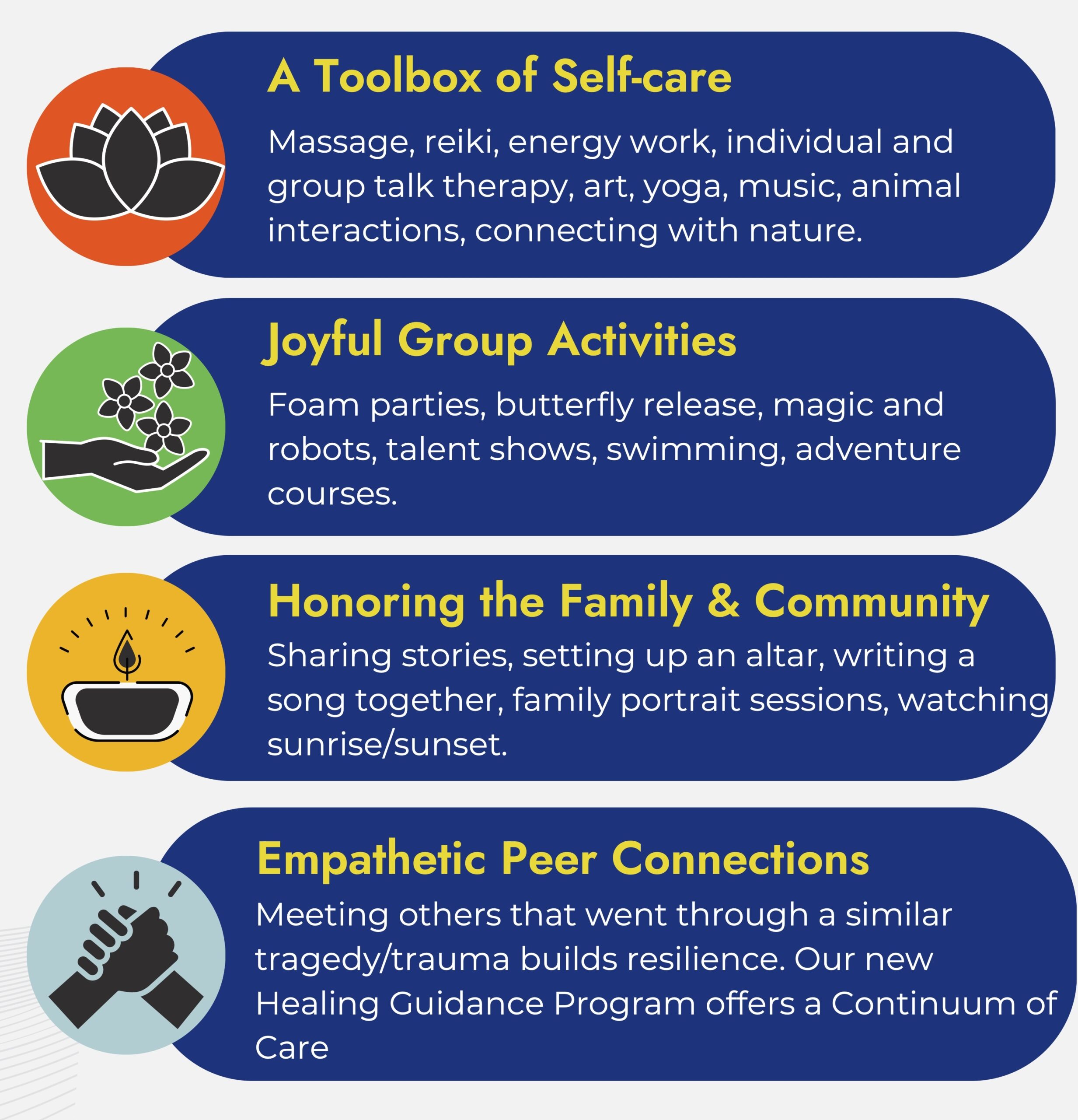We also provide takeaways for families including several art projects, a collaborative song, professional family photos, and a care package of thoughtful gifts. After our retreats, we conduct virtual monthly support groups— both for parents of survivors and those who are grieving.