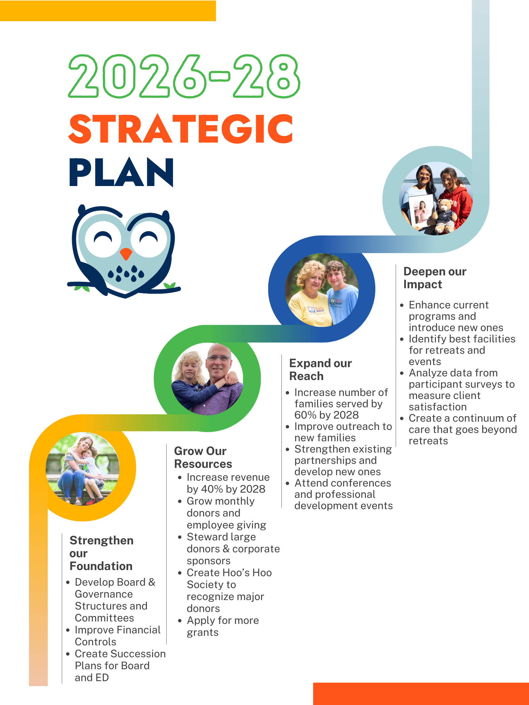 Our strategic priorities for the next three years are four-fold—to Strengthen our Foundation, Grow our Resources, Expand our Reach, and Deepen our Impact–bringing the healing power of connection and compassion to more families each year.